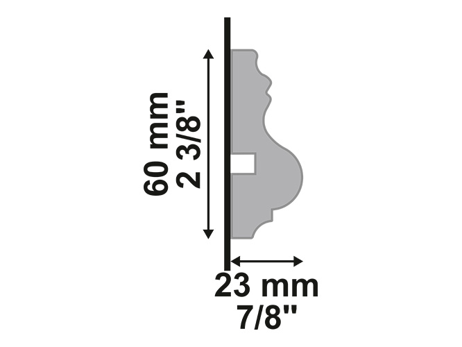 This chair rail 467 is painted white from factory and is made of a raw material called polystyrene, technically known as PS. The white chair rail 467 is part of the Classic Collection, which includes other products, such as bases, casings, crowns and accessories, like plinth blocks and rosettes. These profiles are eco-friendly and sustainable because they are made from recycled EPS (STYROFOAM®). After recycling the plastic, 96% of it is used as raw material for the production of mouldings and wall paneling. Once these profiles have reached the end of their useful life, they can be recycled and transformed into raw materials once again for the production of new products. This chair rail has several interesting features that differentiate it from other products in its category. It does not mold, rot, is immune to pests and termites, is water-resistant, and can be used in wet/ humid environments, such as kitchens, bathrooms, and laundry rooms. Its use is for interior environments only. This profile’s board comes in lengths of 7′ 10-1/2″ (2.4m) by factory standard (which may be customizable upon request).